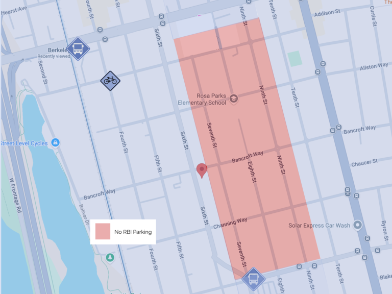 If you need to arrive by car, park west of 6th Street, where more street parking is available. No guest parking is allowed on 7th St, 8th St, or 9th St, or on Bancroft east of 6th St – this is in care of our residential neighbors. Anyone reported parking east of 6th St will be asked to pay a $40 fine towards RBI’s fund for bikeeastbay.org. See map below for details.